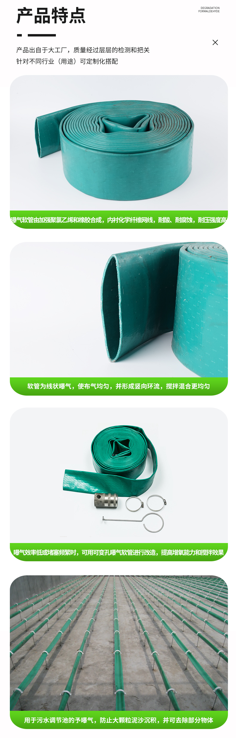 曝氣軟管是引進(jìn)西德技術(shù)開(kāi)發(fā)成功的新型增氧曝氣器。薄壁、直通道極大降低了曝氣阻力損失;可變孔及狹縫自動(dòng)開(kāi)閉,徹底解決了曝氣器的堵塞問(wèn)題;軟管為線狀曝氣,使布?xì)饩鶆颍⑿纬韶Q向環(huán)流,攪拌混合更均勻;氣泡小,氧利用率和動(dòng)力效率高。