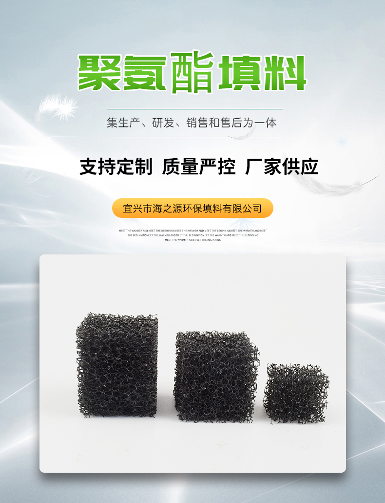 聚氨酯填料作為一種多孔網(wǎng)狀填料,可為微生物提供附著生長(zhǎng)載體,反應(yīng)器內(nèi)微生物量,提高處理效果。聚氨酯填料孔隙為網(wǎng)狀,內(nèi)部具體結(jié)構(gòu)多為大孔,小孔,微孔,多邊形共布,通過經(jīng)絡(luò)使得面與面相交,且構(gòu)成填料的內(nèi)部骨架,起到支撐作用。。聚氨酯填料相比其他填料具有較大的比表面積,孔隙率可達(dá)95%以上,有利于水中物質(zhì)的傳遞與擴(kuò)散,可作為生物膜法,提高污、廢水處理效率,是一種較為理想的生化污水處理填料。