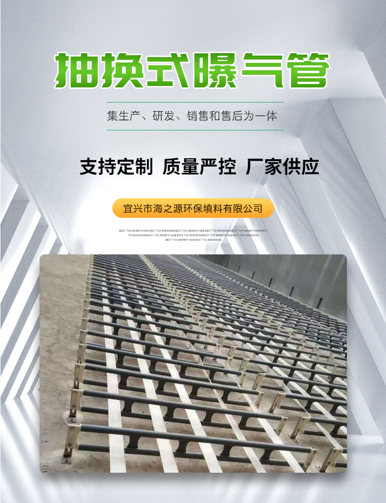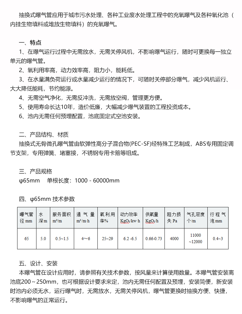 抽換式無(wú)骨微孔曝氣管由軟彈性高分子混合物(PEC-SF)經(jīng)特殊工藝制成,ABS專用固定調(diào)節(jié)支架,專用彈簧、堵塞接,不銹鋼專用卡箍等組成。
