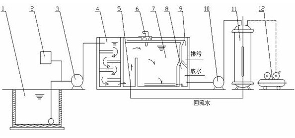 氣浮裝置的工作原理是在一定條件下,將大量空氣溶于水中,形成溶氣水,作為工作介質(zhì),通過釋放器驟然減壓,快速釋放,產(chǎn)生大量微細(xì)氣泡粘附于經(jīng)過混凝反應(yīng)后廢水中的“礬花”上,使絮體上浮,同時用刮渣機刮除,從而迅速地除去水中的污染物質(zhì),達(dá)到凈水的目的。 產(chǎn)品特點 1、裝置廣泛應(yīng)用于造紙、印染、制革、電鍍、紡織、石油、化工、食品等相對領(lǐng)域; 2、在給排水處理工藝中對固液、液液和比重近于水的微小懸浮物的進(jìn)行去除; 3、占地面積小,單位面積產(chǎn)水量高,渣體含水率低; 4、溶入的氣體經(jīng)驟然減壓釋放,產(chǎn)生的氣泡不僅微細(xì)、粒度均勻,密度大,而且上浮穩(wěn)定,對液體擾動微小,特別適用于對疏松絮凝體、細(xì)小顆粒的固液分離; 5、加壓條件下,空氣溶解度大,供氣浮用的氣泡數(shù)量多,能夠確保氣浮效果; 6、部分回流式處理效果顯著、穩(wěn)定、并能較大的節(jié)約能耗; 7、工藝過程及設(shè)備簡單、造價低、便于管理和維護(hù); 8、設(shè)備調(diào)試后,正常運行可達(dá)到自動化無人管理狀態(tài)。 適用范圍 1、電鍍廢水重金屬離子,如鉻、鋅、銅、鎳、鉛等總含量在50ppm以下,去除率均70%以上; 2、印染廢水的色度去除達(dá)90%左右,COD去除率達(dá)60~70%左右,BOD去除率達(dá)50%左右; 3、食品屠宰和制革廢水的COD去除率達(dá)70%左右,懸浮固體去除率達(dá)90%左右; 4、煉油廢水的油脂,可降到10mg/L以下,廢水能達(dá)到澄清程度; 5、對化工廢水和顏料油漆等,COD去除率達(dá)74%,色度去除率達(dá)93%左右; 6、造紙白水的纖維回收率可達(dá)95%左右,COD去除率達(dá)86.7%左右,清水完全回用; 7、大池沐浴水濁度可穩(wěn)定在10℃以下,水中的細(xì)菌有較大幅度下降; 8、生活飲用水及工業(yè)的濁度可凈化的5℃以下,同時對色度耗氧量降低有良好的效果。 工藝說明 本設(shè)備的工作方法屬于加壓溶氣氣浮法,其工作原理:在一定條件下,將大量的空氣溶于水,形成溶氣水,作為工作介質(zhì),通過釋放驟然減壓,快速釋放,產(chǎn)生大量的微細(xì)氣泡,粘附于經(jīng)過混凝反應(yīng)后的廢水中的"礬花"上,使絮體上浮進(jìn)行清除。 1. 調(diào)節(jié)池 2. 投凝劑設(shè)備 3. 污水泵 4. 折板聚凝池 5. 釋放器 6. 刮渣機 7. 氣浮池 8. 溶氣水存放池 9. 污泥池 10. 溶氣水泵 11. 溶氣罐 12. 空壓機