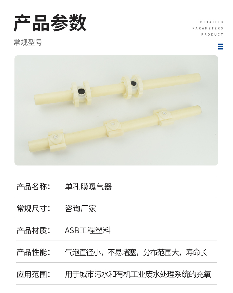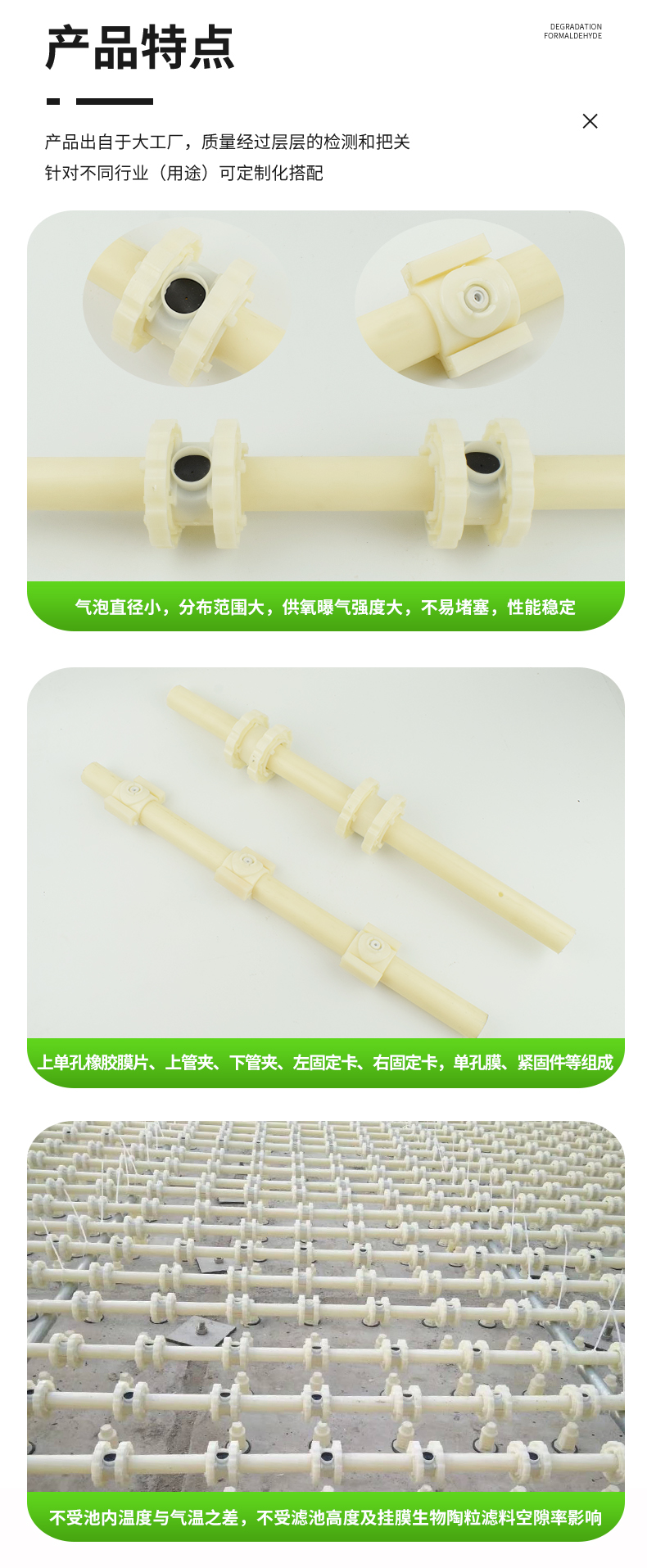 單孔膜曝氣器,是BAF曝氣系統(tǒng)中的重要部件,能為好氧微生物提供充足的溶解氧。單孔膜曝氣器不受池內(nèi)溫度與氣溫之差,不受濾池高度及生物陶粒濾料空隙率影響,氣泡直徑小,分布范圍大,曝氣器出氣口設(shè)計有獨特的凹凸結(jié)構(gòu),不易被堵塞,不怕生物陶粒濾料堆壓。由于其結(jié)構(gòu)特殊,所以在安裝、使用中需要按照相關(guān)要求進行操作。