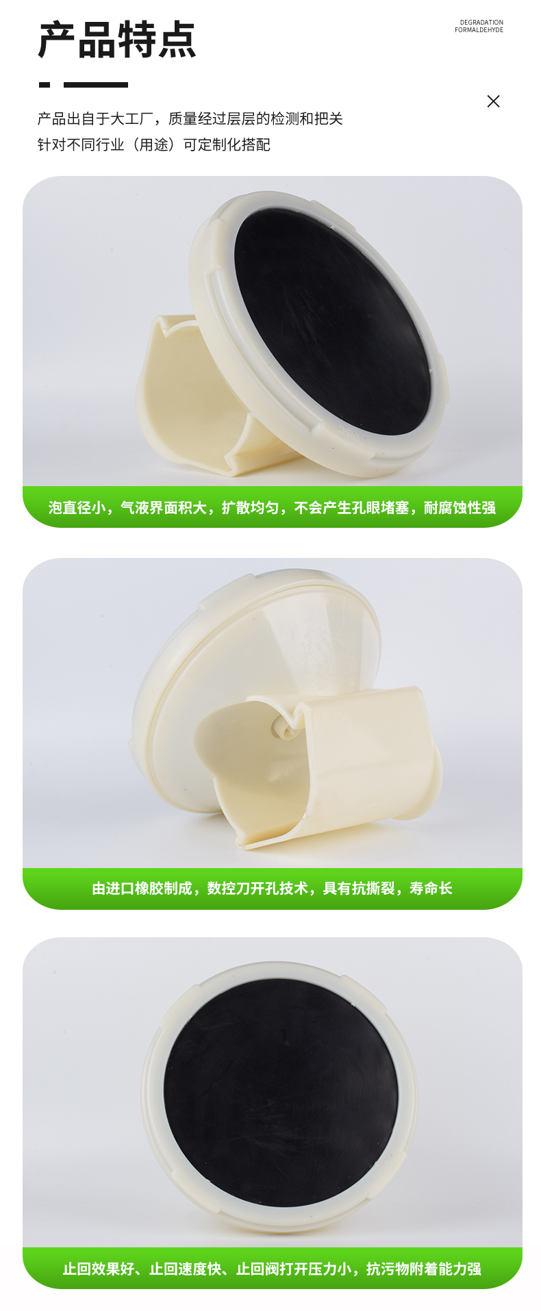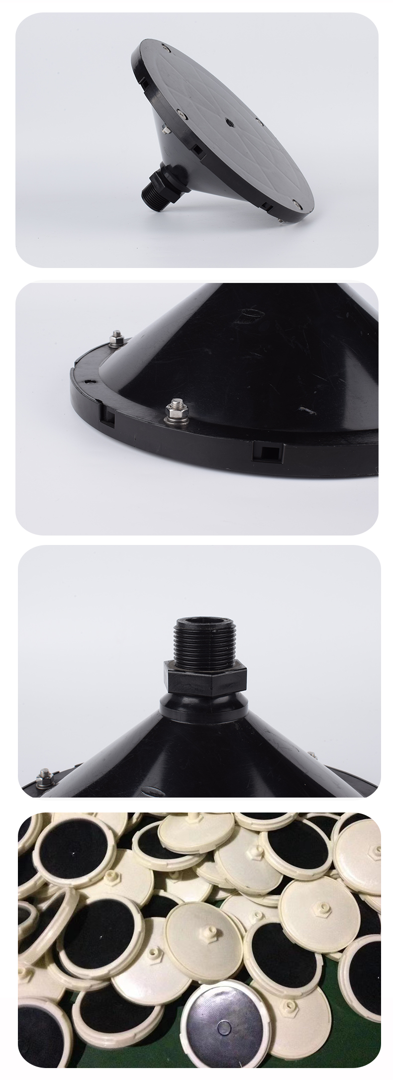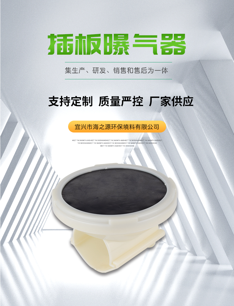 插板曝氣器由底盤(pán)、布?xì)獗P(pán)、合成橡膠膜片、壓固圓環(huán)、空氣導(dǎo)流板、連接底座與配氣管連接的連接件組成。底座由ABS塑料制成,底座與壓固圓環(huán)上均有螺紋,EPDM橡膠膜片覆蓋在空氣均流板上,在固定圈的作用下能保證在膜片(周?chē)宦,橡膠膜片在有均勻分布的孔眼,該種橡膠膜片采用多道特殊工藝加工而成,其性能穩(wěn)定,耐中濃度酸、堿、油等介質(zhì)。
