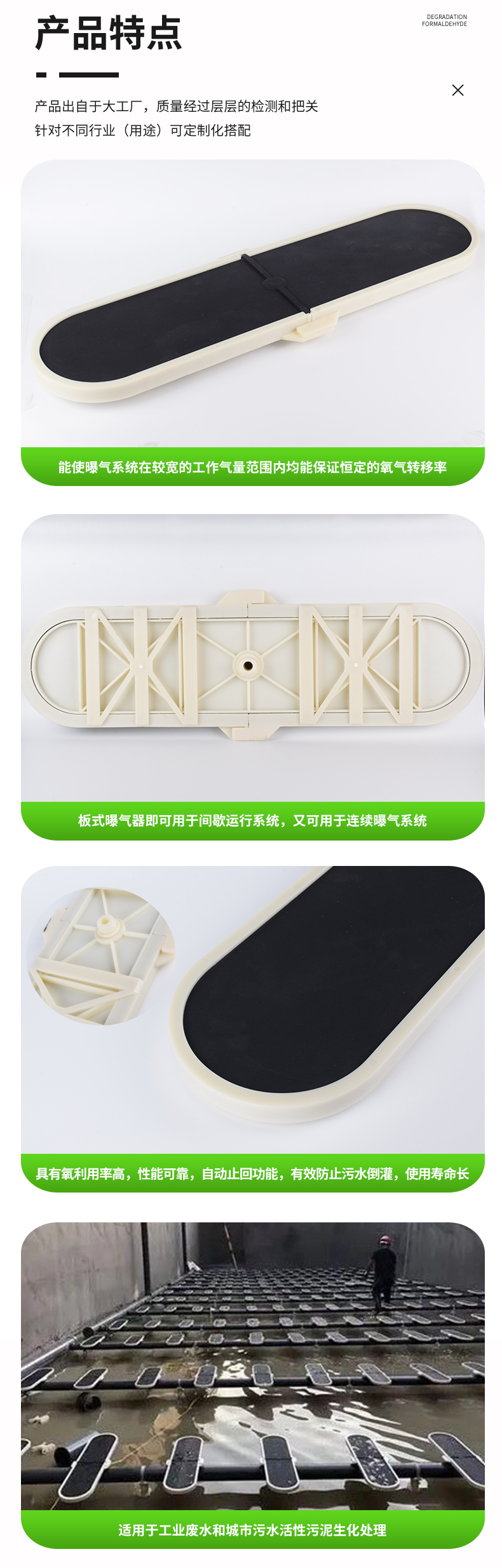 板式曝氣器設(shè)計結(jié)構(gòu)使曝氣器系統(tǒng)在較寬的工作氣量范圍內(nèi)保持低能耗、高效率;開孔方式,在鼓風(fēng)機工作的過程中,曝氣器產(chǎn)生的氣泡均勻,達到很好的蓮花效應(yīng);該曝氣即可用于間歇運行系統(tǒng),又可用于連續(xù)曝氣系統(tǒng),具有氧利用率高,性能可靠,曝氣器具有自動止回功能,有效防止污水倒灌,使用壽命長等特點。