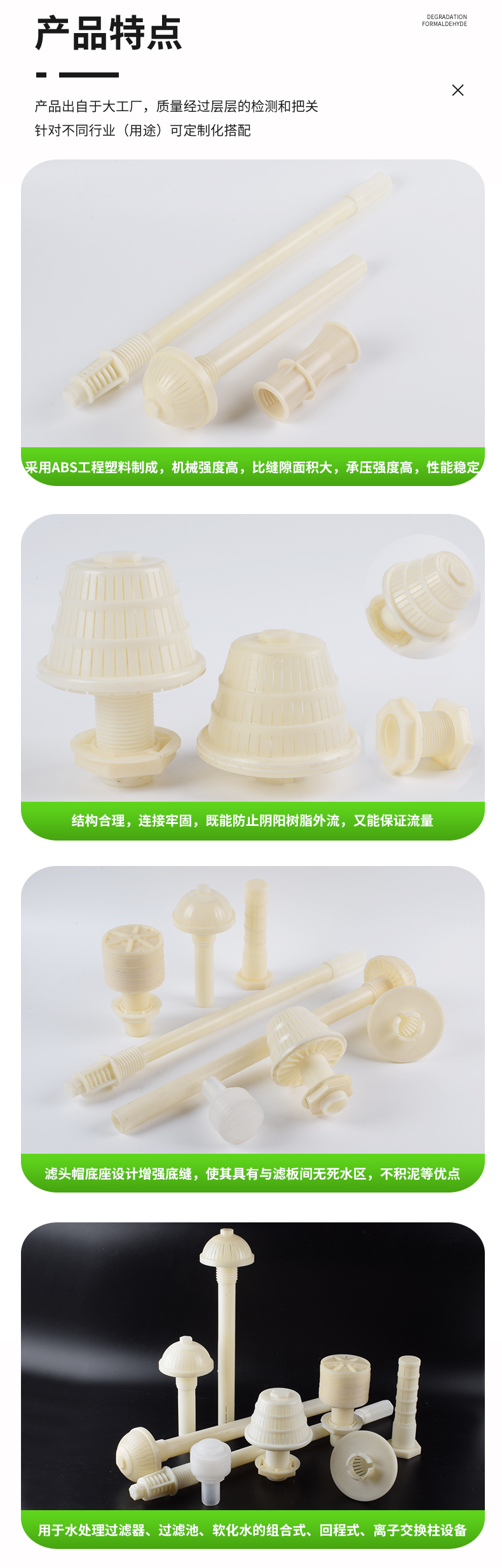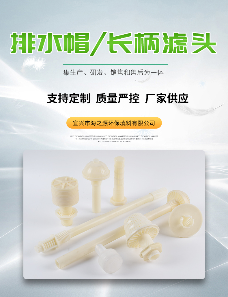 濾頭又叫濾帽,用在濾池配水系統(tǒng)和過(guò)濾器中。反沖洗濾頭包括排水帽、濾水帽兩種,均采用ABS工程塑料制成,結(jié)構(gòu)合理,連接牢固,承壓強(qiáng)度高,縫隙不變型,使用效果好,既能防止陰陽(yáng)樹脂外流,又能保證流量。適用于濾池汽水反沖洗系統(tǒng)和軟化水質(zhì)組合式,壓力式,回程式及離子交換器等水處理設(shè)備的過(guò)濾裝置。
