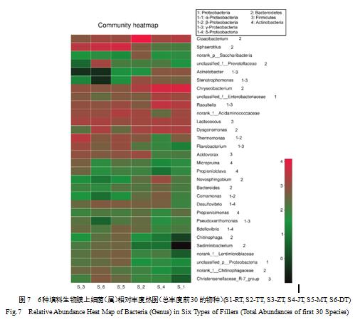 為進一步揭示其群落結(jié)構(gòu)差異,基于細菌菌門水平(圖6)、變形菌門(表3)及菌屬水平(圖7)分析生物膜上的微生物群落結(jié)構(gòu)組成。由圖6可知,從菌門水平來看,不同填料反應(yīng)器中微生物群落組成的差異不是特別大。6種填料生物膜樣本的主要菌群均為變形菌門(Proteobacteria)、擬桿菌門(Bacteroidetes)、厚壁菌門(Firmicutes)及放線菌門(Actinobacteria)。以MT反應(yīng)器為例,其生物膜樣本變形菌門占比達56.2%,其次是擬桿菌門(25.3%)、厚壁菌門(14.8%)。其他5種填料生物膜樣本上的變形菌門占比介于28%~54.3%,擬桿菌門占比介于23.5%~57.3%,厚壁菌門介于9.2%~16.1%。該結(jié)果與前人研究結(jié)果相近,如Ma等[21]在序批式反應(yīng)器中發(fā)現(xiàn)的細菌群落組成中變形菌門(占比最大)、擬桿菌門及放線菌門占優(yōu)勢;Snaidr等[22]在常規(guī)活性污泥中對菌群多樣性的研究中發(fā)現(xiàn)變形菌門(Proteobacteria)為優(yōu)勢類群。在6個樣品中還有綠彎菌門(Chloroflexi)、浮酶菌門(Planctomycetes)、綠菌門(Chlorobi)及單胞菌門(Gemmatimonadetes)等,但所占比例均不同。其中綠菌門在顆粒化過程中有重要作用,能夠增強污泥的沉降性能。