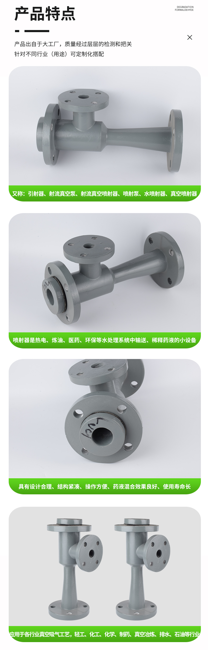 噴射器--原WGP型,適用藥液:鹽酸、堿 。噴射器是熱電、煉油、醫(yī)藥、環(huán)保等水處理系統(tǒng)中輸送、稀釋藥液的小設(shè)備,具有設(shè)計(jì)合理、結(jié)構(gòu)緊湊、操作方便、藥液混合效果良好、使用壽命長(zhǎng)等優(yōu)點(diǎn)。調(diào)節(jié)濃藥液進(jìn)口閥門及調(diào)節(jié)墊片的厚度,使出口藥液達(dá)到所要濃度。注意:安裝時(shí)需要特別注意噴射器法蘭與鐵法蘭之間的平行度和垂直度。